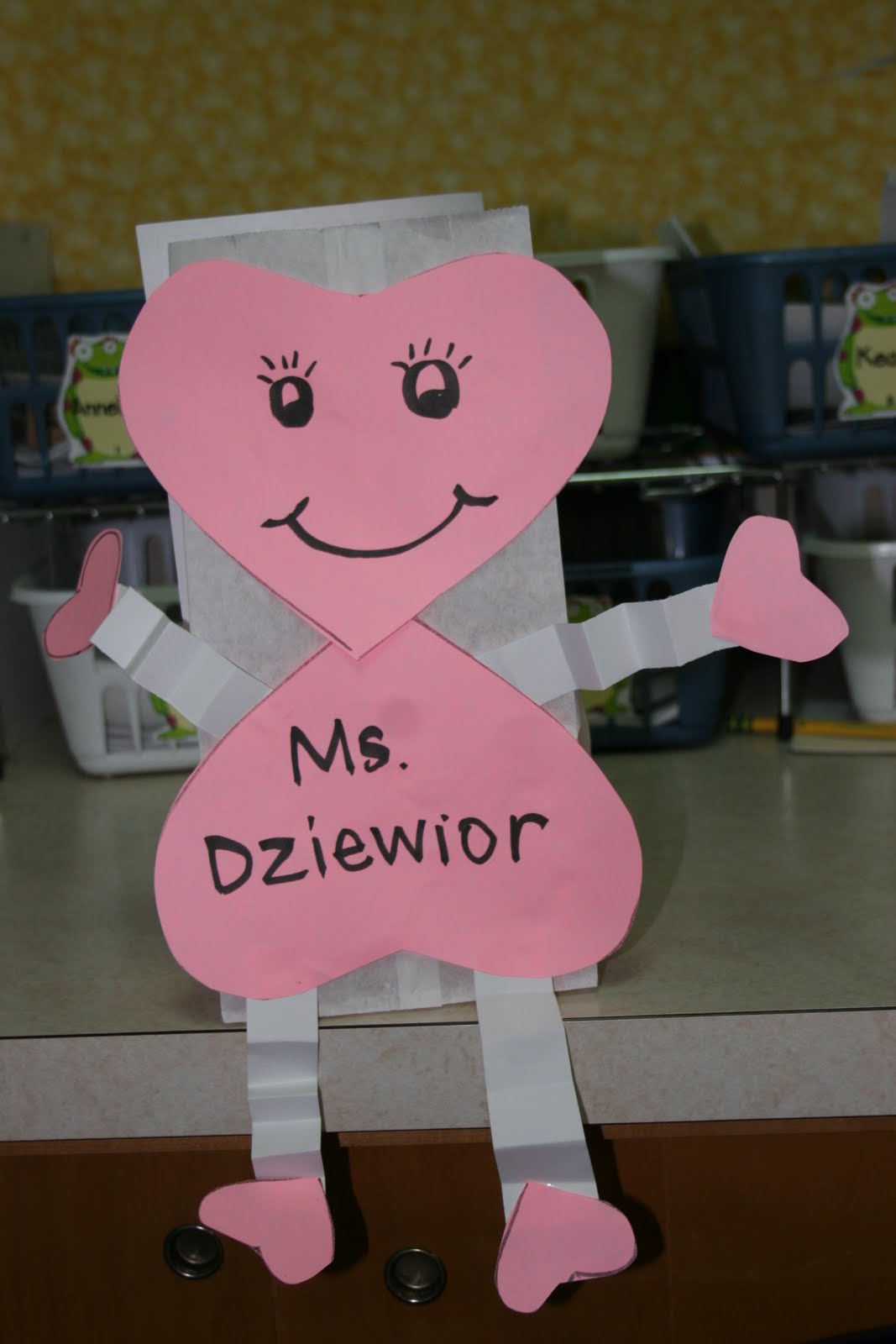 Typically, for Valentine's day the kids are to make their own valentine box at home, but there always seems to be a lot of problems when distributing the valentines, and then trying to get them out of the box without breaking it, etc. So this year I decided we would make valentine bags in school - and it worked out MUCH better! I based the "heart man" on a poem/story I had from years ago called the Valentine Man. We glued a copy of the poem to the back. You can pick up your copy HERE. (Sorry, I have no idea who the original author was!)